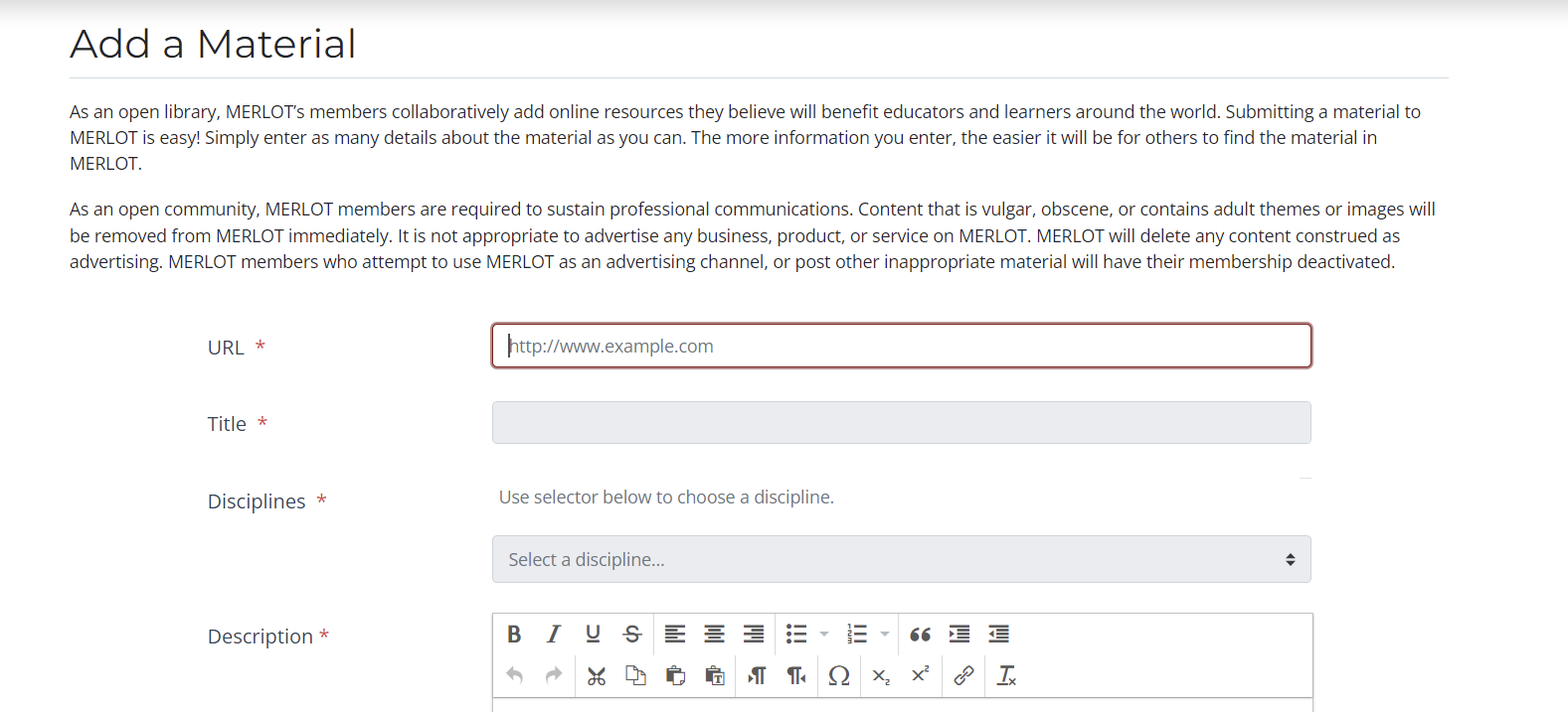 - Once you’re signed in to your account, click on the ‘Add’ menu in the top left bar and choose ‘Add a Material to MERLOT’