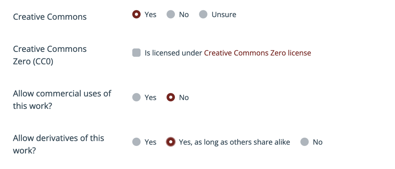 5. When you get to the ‘Creative Commons?’ part of the form, click ‘Yes’. This will allow you to make choices that determine the type of licence to be applied to your work. In the example below, selections have been made that would result in a CC BY NC SA licence, allowing derivatives but requiring that the resource is shared on the same licence as the one you’ve applied to your work.