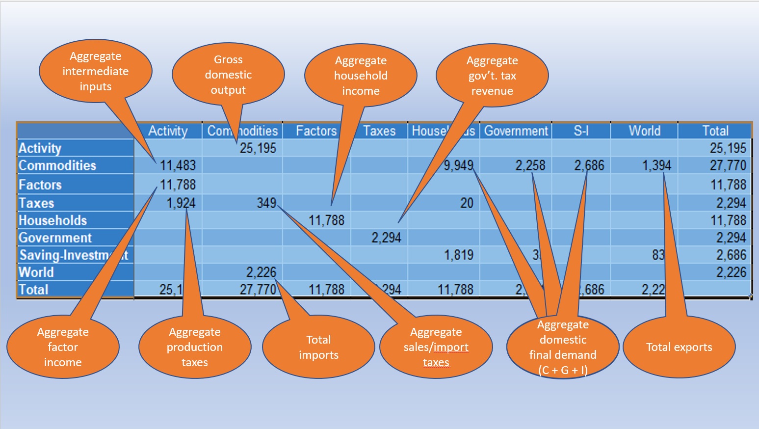 The orange bubbles in Table 2 define the key macro data that have been aggregated from micro data. Note that the US333 SAM has a single household type. If the CGE model database has multiple household types, the household columns and rows would be similarly aggregated into one household account.