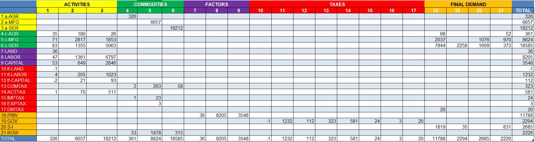 The rows and columns for commodities in the micro SAM (labeled 4, 5 and 6, and shaded in green), are similarly aggregated a single commodity row account and a single commodity column account in the macro SAM. The rows and columns for factors of production, the rows and columns for taxes, and each element of final demand in the US333 SAM are also aggregated.