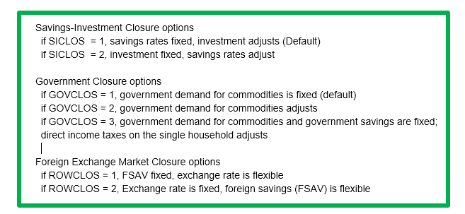 Model closure is an important decision that will to some extent predetermine the results of your experiments. You may need to change closures to selections that best represent the economy you are studying and that are appropriate for your research questions.