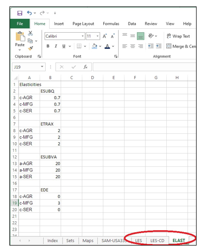 Before running your model, check the elasticity parameter values in your country data file. Ensure they are the appropriate selection for your experiment. Elasticities are defined in the Excel country data file. Look at the worksheets for LES and ELAST (Figure 3).