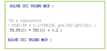 The model code in Figure 4 shows that the experiment that redefines the capital account balance (FSAV) is turned off. The experiment that redefines the tariff rate (TM) is turned on.