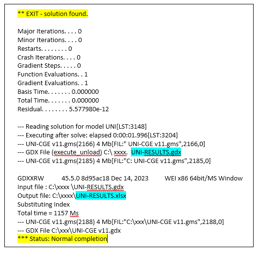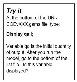 The .lst file reports the full model and model results. Because you chose a GAMS setting that opens the .lst file after running the model (see “Getting Ready; Download GAMS and the UNI-CGE Model), the .lst file will pop open in the main display window in GAMS. The .lst also displays any data for which the model has a display command.