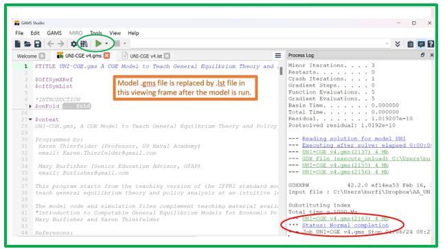 Now run the UNI-CGE model – the UNI-CGE.gms file. Click on that file name in the menu bar, then click on the green arrow, circled in green in Figure 2. As the model solves, a process log opens on the right side of the screen. The log tells you whether the model has solved successfully. In this example the model solves successfully, as reported in the line of code circled in red. If the model fails to solve, the process log will identify the errors you must correct.
