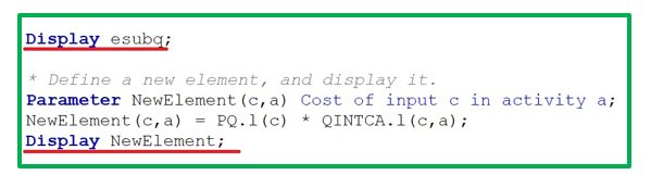 You can also define new elements that are not in the GAMS model and command that they be displayed in the .lst file. As an example, we create and define a parameter named “NewElementc,a” the cost of each commodity C used as an intermediate input by production activity A. We define NewElement as price times quantity (PQc,a * QINTCAc,a). After defining the element, we add the command to display it.