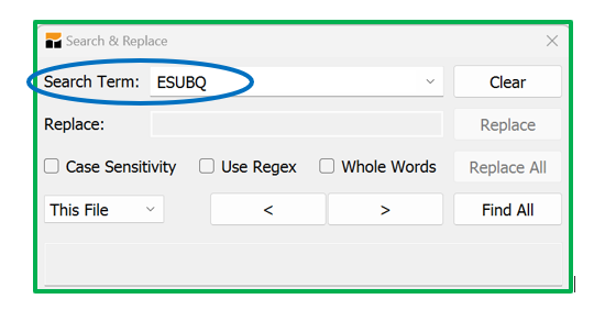 After running the model, find an element that is displayed in the .lst file by typing the command: Control + F. This will open a search box, in which you input the name of the element you want to find. In Figure 4, we search for ESUBQ. If there are many instances of ESUBQ in the .lst file that you want to view, you can click on the “Find All” option. You can also search for each instance by clicking on the forward and backward buttons.