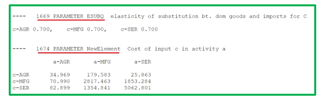 The .lst file prints any item for which there is a “display” command in the GAMS model. Figure 3 shows an example of a command in the GAMS file to display the elasticity “ESUBQ,” the domestic-import substitution elasticity.
