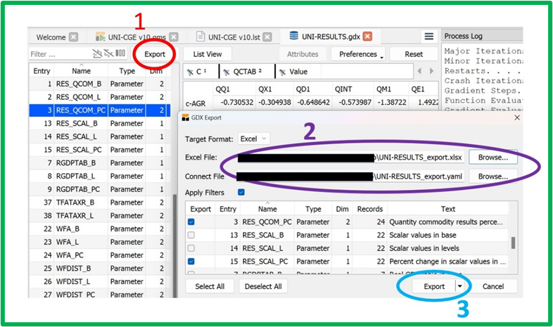 Second, this opens a dialog box, shown on the right side of Figure 5. Select the name of the Excel file that you want to export results to, shown in the purple circle labeled 2 in Figure 5. The default name is the same as the GDX file. Instead, you may want to create Excel files that have the names of scenarios, such as “tariff_cut.xlsx.”