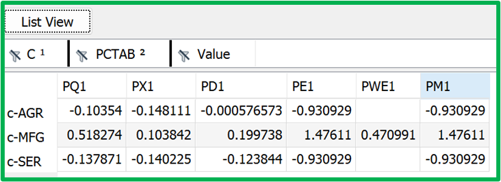 The UNI-CGE model code includes commands to organize key results into tables. This makes it easier to view sets of related data instead of single variables or parameters. Table 1 provides a summary of the tables defined in the UNI-CGE model and their contents.