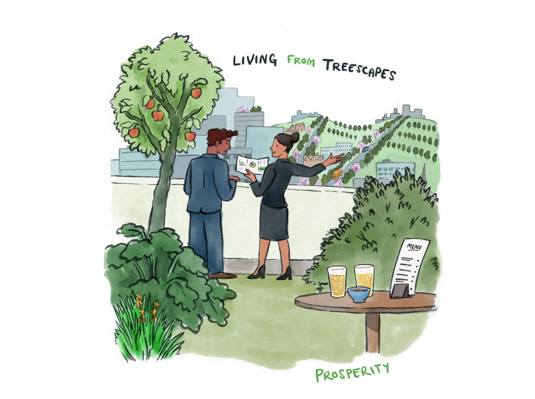 The investment manager handed me a brochure. There were opportunities all over the city. In the centre, exclusive roof gardens for paying customers, with a great looking return. The investment manager pointed out green areas on the edges of the city where there are partnership opportunities to invest in agroforestry, where fruit trees and timber trees are growing amidst other crops and livestock. Tree species that make a mess on the street are now grown in these areas instead and there is less cleaning up for the local authority to do.