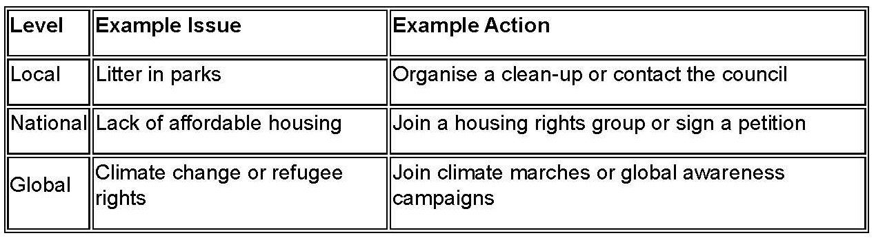 - Are they mostly local (e.g. housing, transport), national (e.g. NHS access, migration policy), or global (e.g. climate change)?